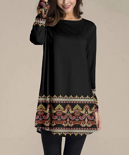 Easily pair your beloved jeans or leggings with this cozy long-sleeve tunic featuring a geometric pattern and a flowy hem. Its stretchy material will keep you comfy all day long.