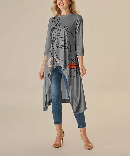 Top off your favorite pairs of leggings or skinnies with this flowing tunic showcasing a bold hi-low hem and printed design.