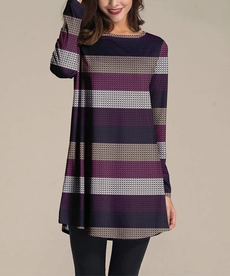 A gently curved hem and long sleeves make this boldly patterned tunic a flowy pick for chilly weekend outings.