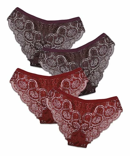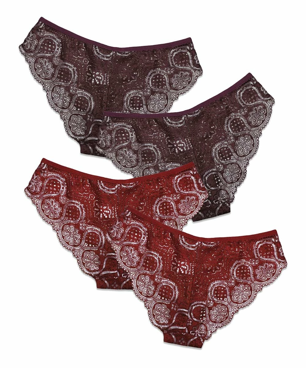 - Includes two red lace Brazilian panties and two burgundy lace Brazilian panties (four panties total)